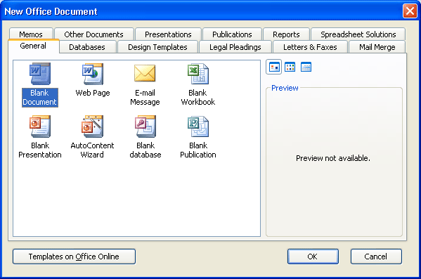 The contents of this box will vary depending on what Office programs you have installed, but the only item we’re concerned with at this point in time is the one already highlighted: Blank Document. Once Blank Document is selected, click OK and Word will open with a fresh document for you.