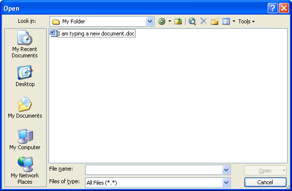 The concept is the same as the Save dialog box. Browse to the location of your file using the icons on the left or the Look-In drop-down menu. Once you see your file, click it once to select it and then click Open. Your file will then open in the main Word window. |