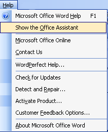 The first item, Microsoft Office Word Help, will open a task pane on the right hand side of the screen to give you several ways to get help. The second option will show the Office Assistant (or hide him if he’s already shown). The third option, Microsoft Office Online, opens http://office.microsoft.com, the Office Web site. This web site has lots of great tools, downloads, and helpful resources. The fourth option, Contact Us, takes you to the support section of the Office Online page. This page offers you contact options for support, questions, and feedback.