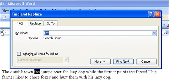 Once your text is entered, click the Find Next button. Word will select the first instance for you. You can stop there and close out of the box by clicking Cancel. If it’s not what you’re looking for, click Find Next again to find the next instance. Here’s an example: