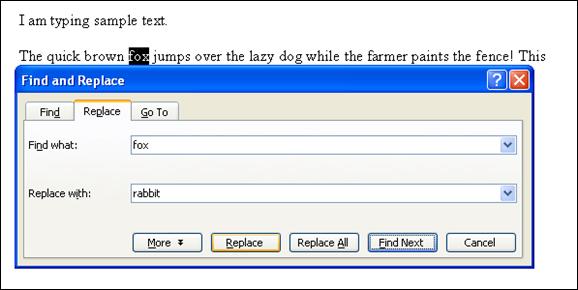 In the sample below, we’ve chosen to replace the word fox with the word rabbit. When we click Replace, it will find the first instance.