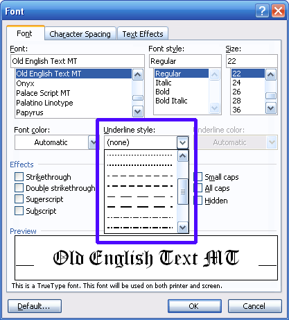 You can use these options to modify the style and colour of underlining. (The colour options will not be available until you have chosen a style.) You can click the style box to choose from a list of styles, like this: