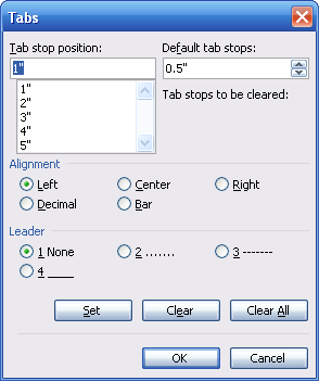 You can select any tab from the tab stop position list, and modify its position, alignment, or leader. You can also select the tab and click Clear to remove it completely. Or, you can click Clear All to remove all of your set tabs. (This will not remove default tab stops.)
