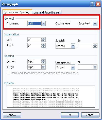 We have two drop-down boxes in the general section. The first is for alignment. You can use the drop-down menu (in the sample Left is selected) to align your paragraph to the left, to the right, in the centre, or justify it. (Remember that justification spreads out your text so that the left and right margins are even.)