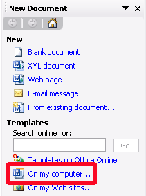 There are two ways to open a pre-defined template in Word. The first way is to click on the Start menu, click on All Programs (or Programs) and click New Office Document. The second way is from within Word, click the File menu and click New. From the New Document task pane on the right, click on my computer… in the templates section (see the picture to the right for an example).