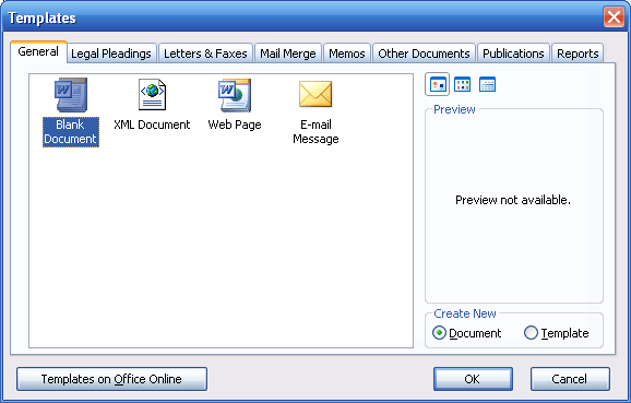 (If you use the Start menu to open this box, you will see more tabs and templates as it shows templates for all the Office programs you have installed.)