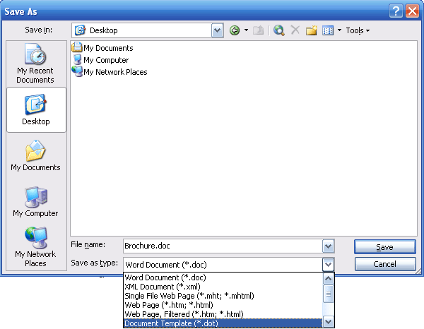 Then, click the File menu and click Save As. Type a name for your file. Then, click the Save as Type drop-down window and pick .dot, like this: