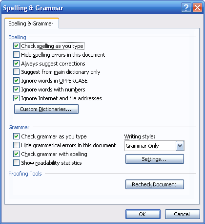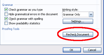 Once we’re back in the main Spelling and Grammar Check Options window, you can click the Recheck Document button to perform a spelling and grammar check with your new settings right away. Or, you can click OK to save your changes or click Cancel to discard them.