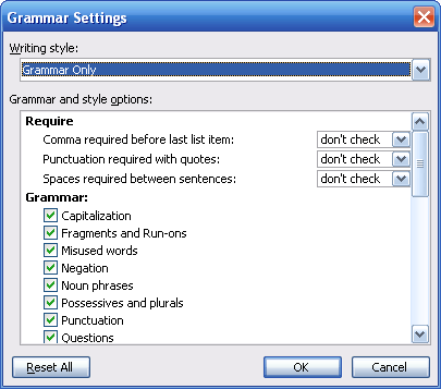 At the top, you can choose which writing style you are modifying, and then modify each option using the bottom portion of the window. (We aren’t going to discuss each option as they are self-explanatory.) Once you’ve made changes, you can use the buttons at the bottom to Reset All items to their default, Cancel your changes, or click OK to apply your changes.