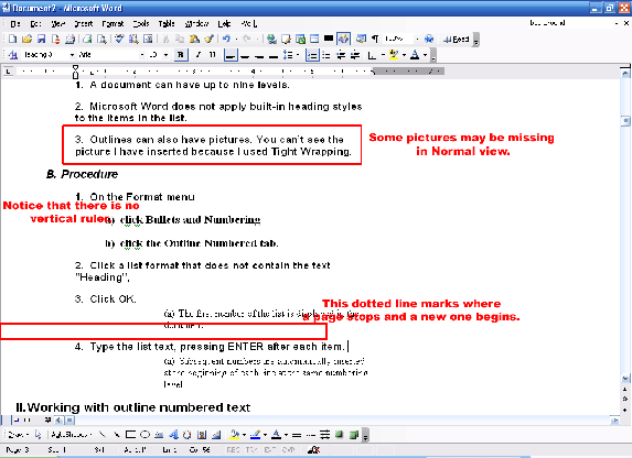 For most documents, you will want to view them in the normal view or the print layout view. Normal view removes some formatting items to make typing and editing text easier. One major change is that the vertical ruler and the white space between pages are eliminated. As well, headers and footers, backgrounds, drawing objects, and pictures (only ones that used square, tight, in front, or behind text wrapping styles) will not be shown.