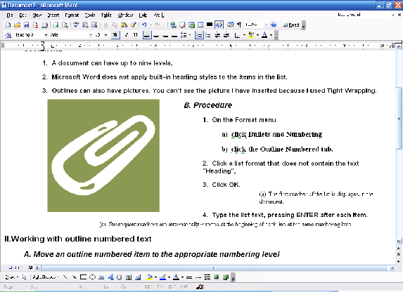 Web layout is best used when creating Web pages. However, it can also be used when creating regular documents. Just remember that your text will appear exactly as it would if you published it to the Internet. For example, your margins will not appear on the screen. This means the text will take up the entire editing window and appear bigger. As well, the vertical ruler is not shown, and no page breaks are shown (because Web pages don’t separate into pages). And, your pictures may look out of place because your text and graphics are positioned as they would be in a Web browser.