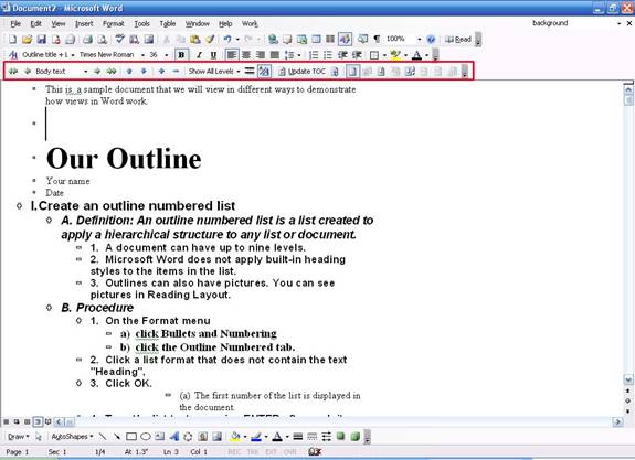 Outline view lets you customize your view based on that structure. Graphics, objects, backgrounds, and rulers are all hidden in Outline view. You can use the Outlining toolbar (which will be added to your view) to move to various levels in your document. We’re not going to get into specifics about this toolbar right now, but let’s look at a sample.