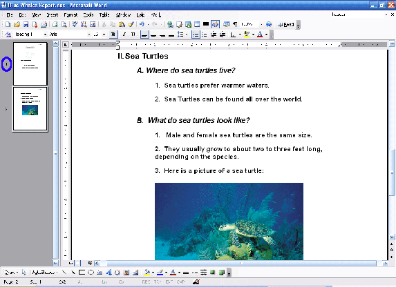 You can enable thumbnails by clicking the View menu and choosing Thumbnails. When you have this option enabled, you will see a vertical strip of thumbnails on the left hand side of your document. Each thumbnail represents a page of your document (the number is on the left hand side of the thumbnail) and shows a very small preview of that page’s contents. You can click on a thumbnail to jump to that page. Here’s an example: