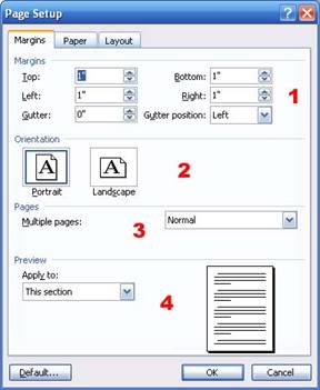 The first section, titled Margins, lets you specify margin and gutter options. Margins are the white space around a document; different margins can be set for the top, bottom, left, and right of the document. To change a margin, just enter the number of inches you want in the appropriate text box.