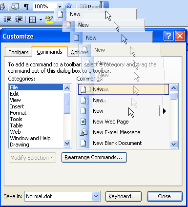 We’re going to start with the middle tab (Commands) which is shown above, as this is the tab the Customize window opens to. This tab has two main parts: a categories column and a commands column. The categories column has a listing of the different menus and toolbars. Once you click on a category, its contents will be displayed in the Commands tab. You can take any item from the Commands window and drag and drop it to a toolbar, in an existing menu, or on the menu bar itself (see below image).