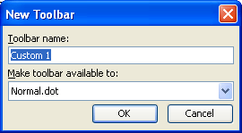 Right now, just worry about the Toolbar Name field; don’t worry about the drop-down menu below it. So, all you have to do is type in the name of your new toolbar and click OK. (You can also click Cancel if you don’t want to create a toolbar.)