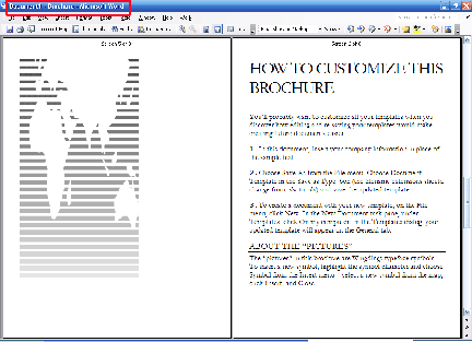 You can see that this template not only has the layout done for you, but the sample text tells you how to save your own template and how to create pictures like they have done. You can also tell that we’re using a template by looking at the title bar (circled in red in the sample above); the template name (Brochure) is after the document name.